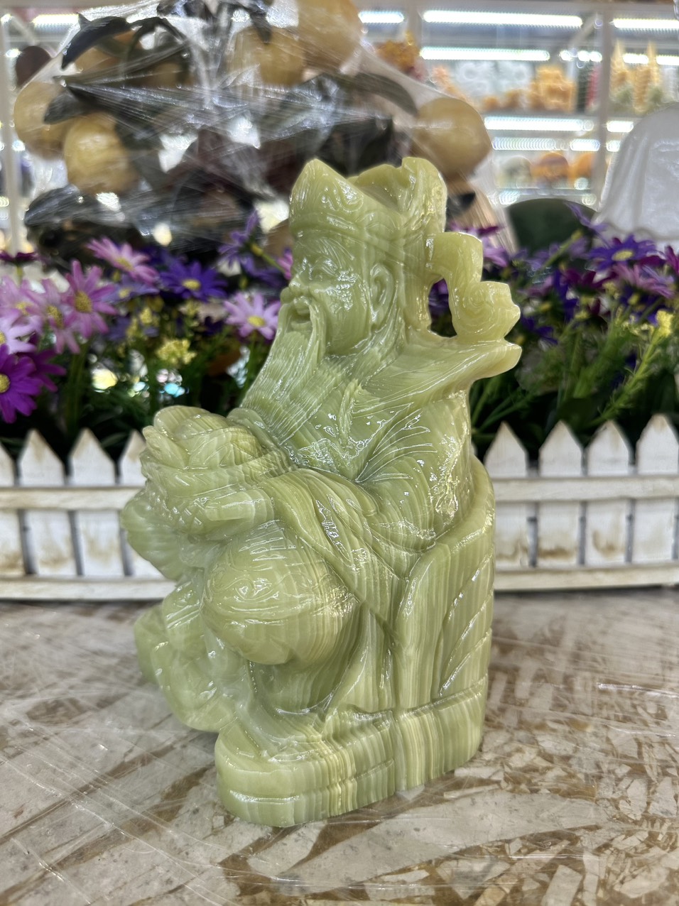Chất liệu: Đá ngọc hoàng long Kích thước: Dài 15 cm x Rộng 10 cm x Cao 20 cm Khối lượng: 4,4 kg Thần Tài là vị thần trông coi tiền tài, vàng bạc, mang