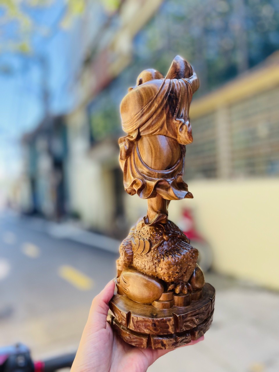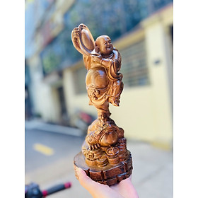 ✨Tượng phật di lặc hai tay ôm thỏi vàng ,chân đứng trên cóc thiềm thừ bằng gỗ bách xanh thơm phức kt cao 30×12×11cm