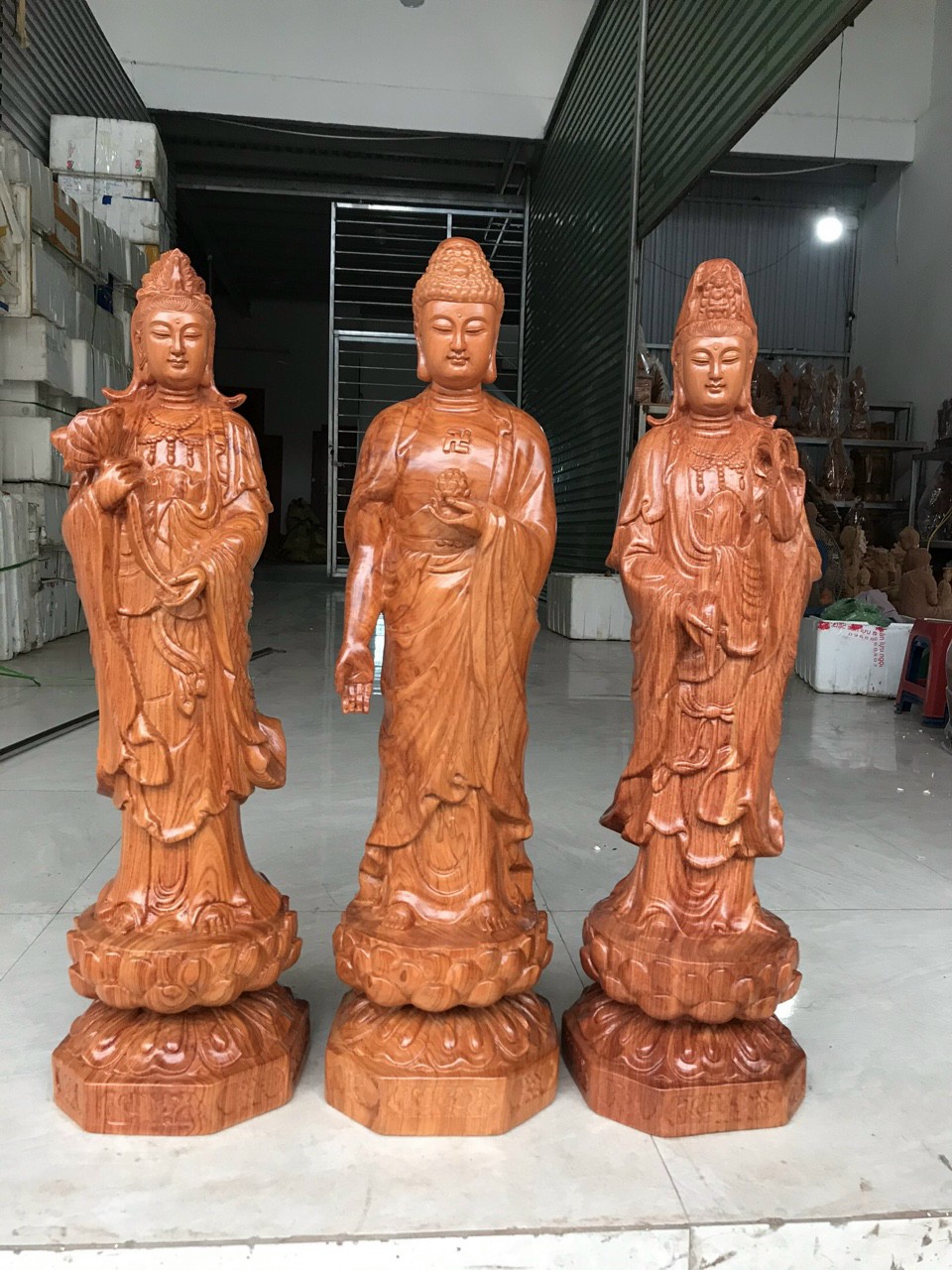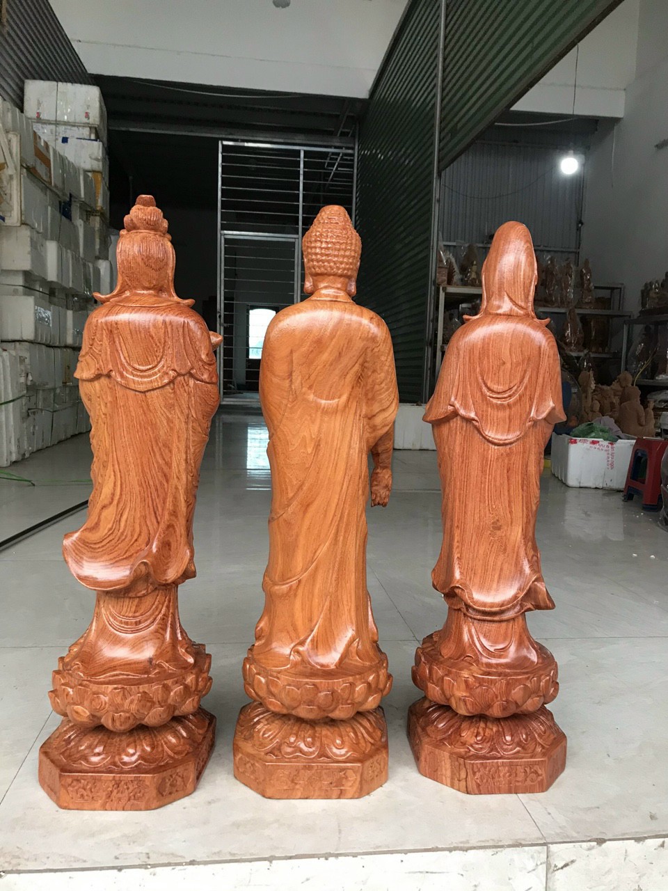 Bộ tượng phật tây phương tam thánh được làm bằng chất liệu gỗ hương đá liền khối khối tự nhiên 100% Kích thước cao 60×20×20cm _ Bộ tượng phật tây phương tam thánh được trạm khắc vô cùng tỉ mỉ ,Tinh sảo kỳ công .Đi hầu hết tất cả mọi chi tiết góc ngách nội dung hoa văn của tượng ,đều được gọt tỉa chỉnh sửa hoàn toàn bằng tay thủ công .Đồng thời tượng được kiểm định kỹ lưỡng như cho vào thẩm sấy cho gỗ khô kiệt .Mục đích trống dập nứt vênh mo mối mọt .Kết hợp với trà nhám ,đánh giấy giáp nhiều nước ,sờ mát lạnh rồi cho vào phun lót làm bóng mờ ,để giữ lại mầu sắc vân gỗ tự nhiên ,Tượng tây phương tam thánh .Được làm và hoàn thiện ,do bàn tay khối óc tài hoa ,Từ những người thợ giàu kinh nghiệm cũng như tay nghề cao trong  làng nghề truyền thống .Chính vì thế bộ tượng phật tây phương tam thánh đã đáp ứng đầy đủ những tiêu trí ( đẹp bền rẻ ) Thẩm mỹ nghệ thuật với chất lượng tuyệt vời