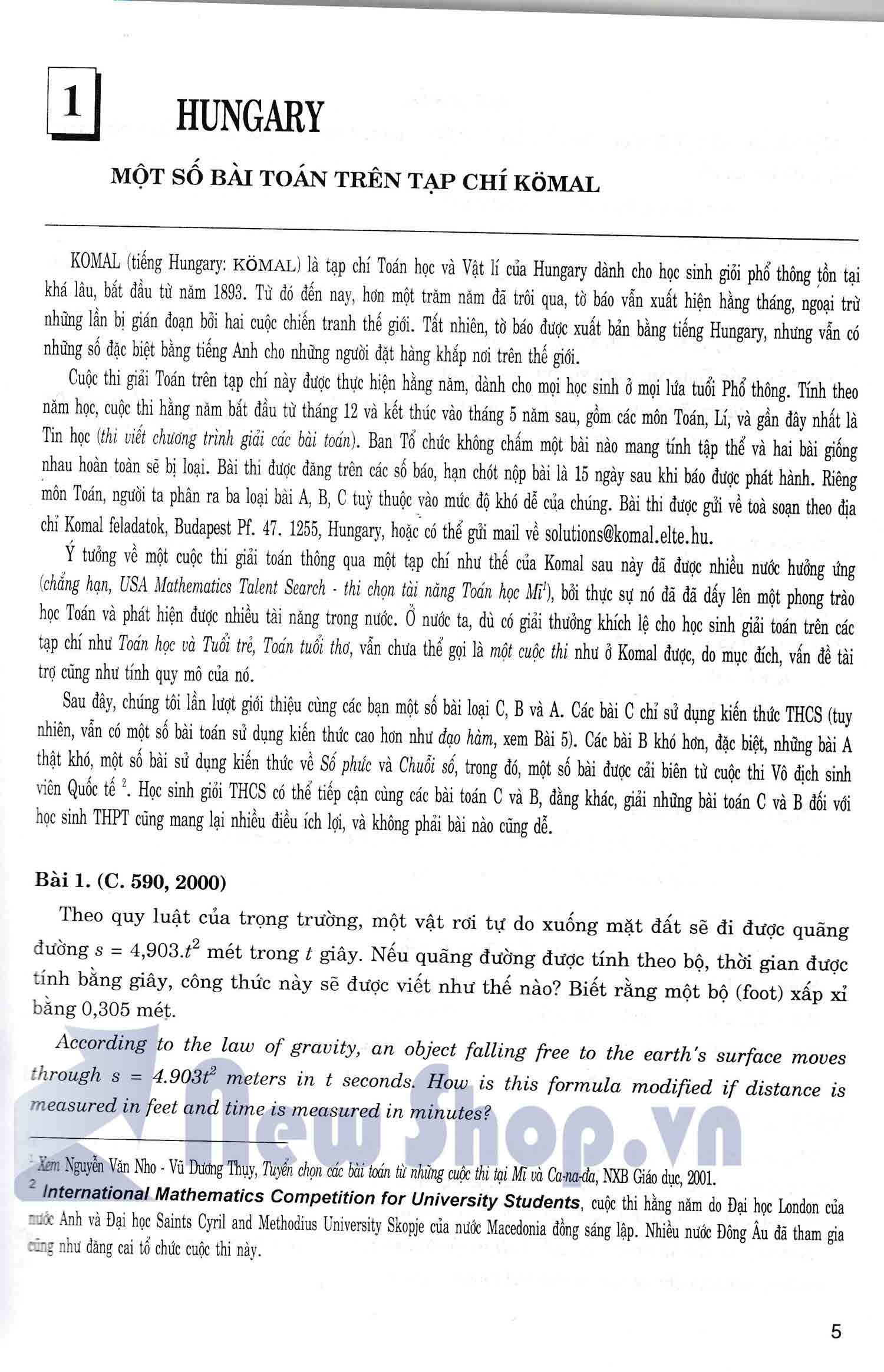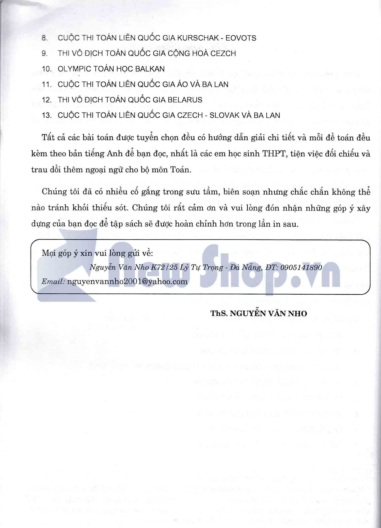 Cuốn sách còn giới thiệu thêm một số bài toán trên các tạp chí như tạp chí Komal, một số cuộc thi liên quốc gia như cuộc thi Áo – Ba Lan, Olympic Toán Balkan…. Tất cả bài toán được tuyển chọn đều có hướng dẫn giải chi tiết và mỗi đề toán đều kèm theo bản tiếng Anh để bạn đọc, nhất là các em học sinh THPT, tiện đối chiếu và trau dồi thêm ngoại ngữ cho bộ môn Toán. Chúc các bạn học tốt !