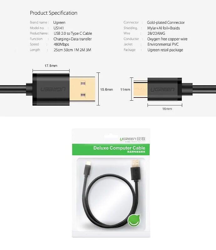 Ugreen 40418 Usb 2.0 To Micro Usb + Type C Data Cable White 1.5M Us142 1. Features: connect Laptop, Tablet USB-C port to digital camera, DSLR, music player, GPS Mini USB port 2. Cable length:
