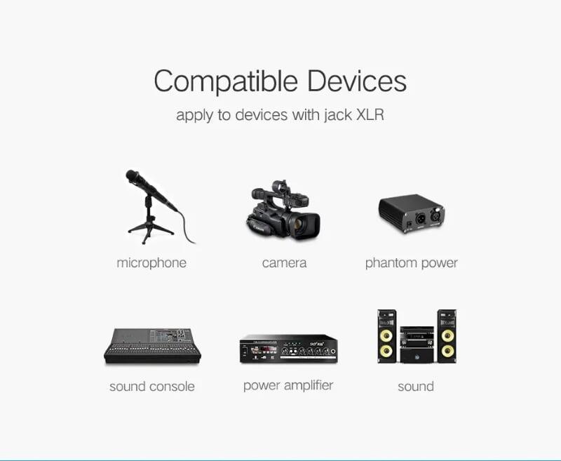 - Compatible with XLR connected devices such as shotgun microphones, speaker systems, stage lighting