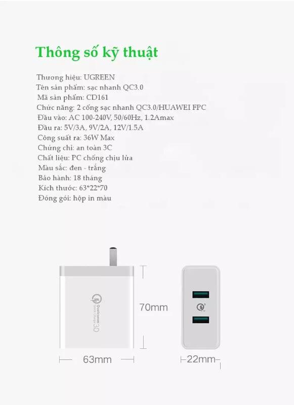 Ugreen 40715 Qc3.0 + Qc3.0 36W Dual Fcp Usb Charger Quick Charge White CD161 1. Input: 100-240V ~ 50 / 60Hz 1.2A 2. Max 2xQuick Charge 3.0 Output: 5V / 3A 9V / 2A 12V