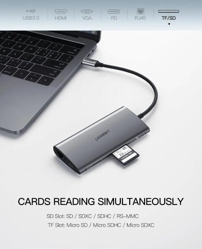 ✨Ugreen UG40873CM179TK Bộ chuyển đổi TYPE C sang 3 USB 3.0 + HDMI + VGA + LAN + SD TF + hỗ trợ nguồn TYPE C - HÀNG CHÍNH HÃNG