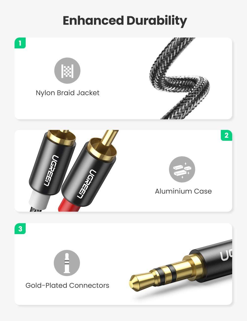 1. Connector A: 1 x 3.5mm Jack Male 2. Connector B: 2 x RCA Female, White (Audio left) Red (Audio right) 3. Cable Material: Nylon Braided 4. UGREEN 3.5mm(1/8" headphone plug) to 2 RCA(Right/Left) stereo