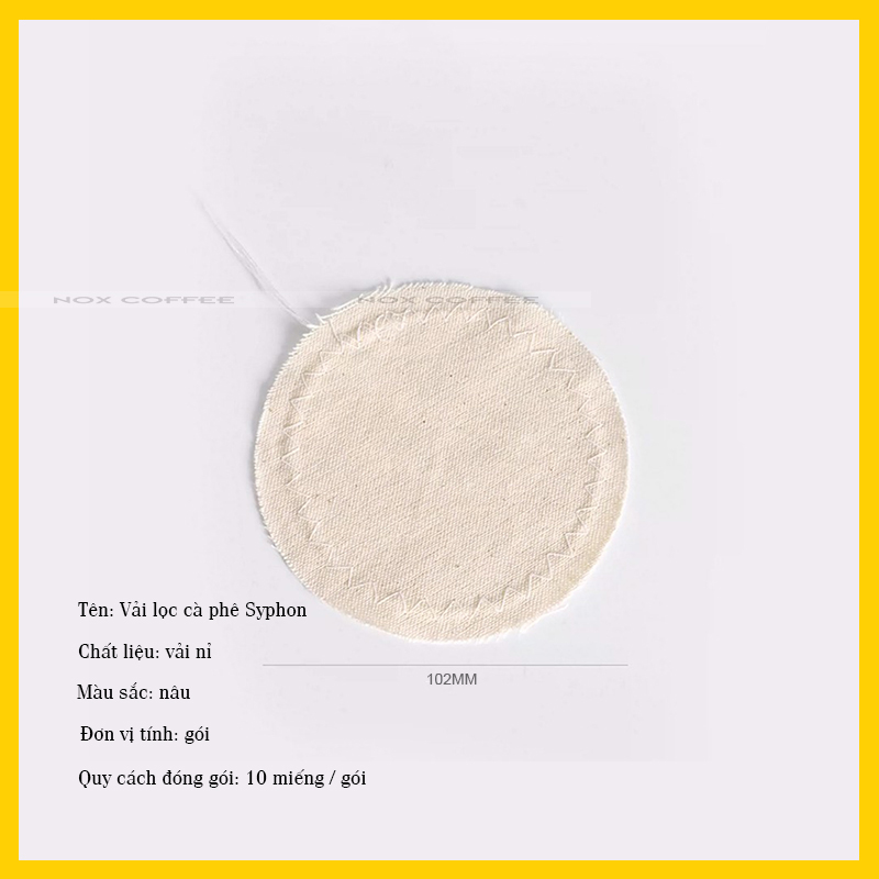 Thông số chi tiết • Chất liệu: vải nỉ • Kích thước: 102mm • Màu sắc: nâu • Đơn vị tính: gói • Quy cách đóng gói: 5 miếng/gói Vải lọc cho bình cà phê