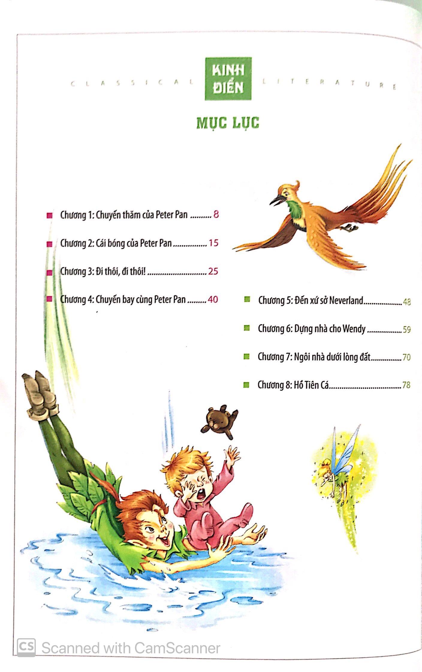 Mua tại TiktokPeter Pan được biết đến là đứa trẻ không bao giờ lớn. Anh chàng dạy 3 đứa trẻ là Wendy, John và Micheal học bay. Nhân lúc bố mẹ không có nhà, chúng đã bay đến xứ sở Neverland bí ẩn. Trên đảo có các nàng tiên nhỏ, đám cướp biển và các nàng tiên cá mà các em nhỏ đã quen thuộc trong truyện cổ tích. Trong câu chuyện, Peter và các bạn nhỏ được cùng nhau vui chơi và trải qua những chuyến du lịch mạo hiểm nhưng không kém phần thú vị. Thông qua hình tượng nhân vật Peter Pan, độc giả sẽ nhận ra rằng: tuổi thơ ấu là một áng văn chương tươi đẹp nhất, mơ mộng nhất trong một cuốn sách lớn của đời người. Mỗi bạn nhỏ, hãy tự viết cho mình một cuốn sách cuộc đời và tận hưởng những niềm vui thuộc về bản thân.