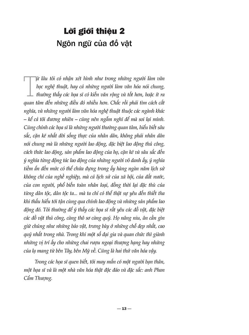 “Nhà vua thường thức giấc vào cuối giờ Dần, khoảng bốn rưỡi sáng, để còn kịp chỉnh trang cho buổi đăng triều, nếu không phải lên triều, ngài có thể dậy muộn hơn một canh giờ. Một thái giám bưng cho ngài một chén trà thuốc súc miệng, nhấp thử trước một ngụm, sau mới dâng lên hoàng đế, rồi ngài nhổ ngụm nước vào ống nhổ bạc miệng rộng. Ngài vén quần ngồi vào chiếc ghế vệ sinh, dưới có đặt một chậu sành. Hoàng cung phong kiến từ thời Hán từng có một ông vua bị ám sát ngay trong nhà xí, nên nó không bao giờ được xây nữa. Vua, hoàng hậu và cung nữ đều đại tiểu tiện bằng chậu. Riêng chậu của vua được ngự y giữ lại để nghiên cứu sức khỏe của ngài ngự qua phân. Xong xuôi, thái giám dùng khăn mềm lau sạch, rồi thấm một chút mật ong vào hậu môn của ngài. Vua khoan thai đi một bài quyền dưỡng sinh trên phương đình của ngự uyển, cũng tại đó, thái hậu đã chuẩn bị bữa sáng đạm bạc, gồm một ấm trà sâm, một đĩa bánh nhỏ bằng bột gạo trứng và mật ong do đích tay bà làm, một bát miến gà. Tất cả món ăn đều được thái hậu kiểm tra và cho người nếm thử. Hai thị nữ sẽ lau người cho ngài bằng nước ấm, thay quần áo trong, rồi khoác bên ngoài áo trong một bộ hoàng bào màu trắng, thêu rồng vàng, nếu ngài không lên triều. Vua được chải tóc vấn thành búi giữa đỉnh đầu rồi lồng vào đó một mũ miện vàng khít với nhục kháo (búi tóc), xỏ giầy đen bằng nhung. Ngài đến ngự thư phòng bắt đầu duyệt tấu sớ.” Đây là đoạn trích miêu tả buổi sáng thường nhật của một bậc đế vương nước Việt thuở xưa trong cuốn Văn minh vật chất của người Việt – công trình khảo cứu tâm huyết cả một đời của họa sĩ, nhà nghiên cứu văn hóa Phan Cẩm Thượng. Điều đặc biệt là cảnh sinh hoạt sinh động đầy màu sắc như một đoạn phim này không phải được phục dựng từ những trang sử, cũng không phải từ trí tưởng tượng của tác giả viết ra, mà là qua việc gạn lọc những thông tin tế vi đang mã hóa trong những đồ vật của các vương triều còn sót lại và lưu giữ cho đến ngày nay. Đây cũng chính là điểm đặc biệt và khác lạ nhất của Văn minh vật chất của người Việt – phương pháp tiếp cận và vẽ lại lịch sử hình thành và phát triển của dân tộc Việt thông qua những trầm tích thông tin ẩn tàng trong các đồ vật, từ những thứ dung dị trong cuộc sống hàng ngày đến những món đồ vàng son của các bậc đế vương. Trước tác giả Phan Cẩm Thượng, chưa từng có công trình khảo cứu nào tiếp cận lịch sử văn minh dân tộc thuần nhất từ góc độ này. Bằng sự nhạy cảm đặc biệt của các họa sĩ, trí tưởng tượng của một nhà văn kết hợp với sự tỉ mẩn, óc khoa học của một nhà nghiên cứu, tác giả Phan Cẩm Thượng đã có thể khiến các đồ vật tưởng chừng “vô tri” phải cất lời bằng thứ mật ngữ của riêng chúng, để kể lại những câu chuyện về bao nếp ăn, nếp sống, nếp làm của hàng ngàn năm người dân Việt hiện lên rõ ràng, sinh động, tươi tắn một cách khác thường mà có lẽ không cuốn sách sử hay báo cáo khảo cổ học nào khác có thể làm được.