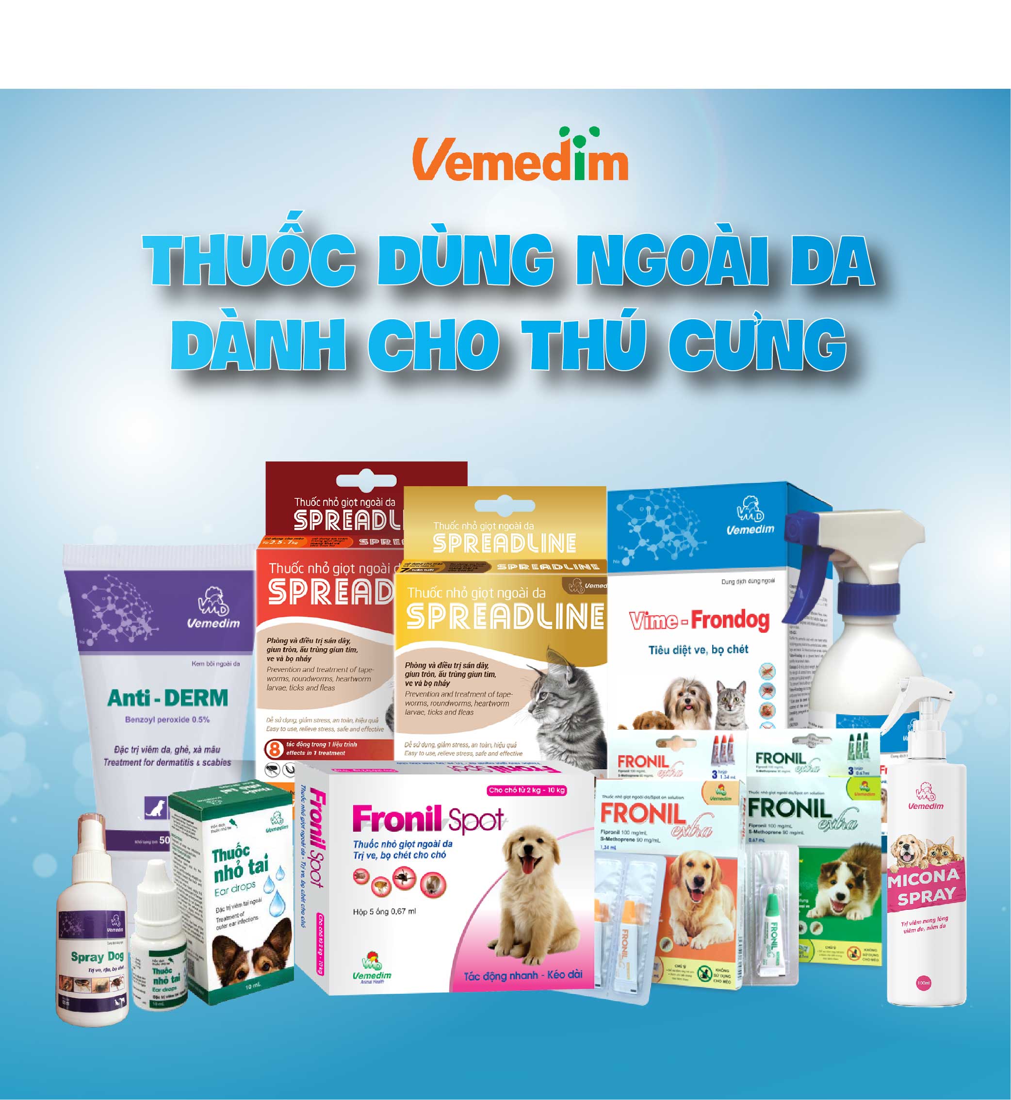 * Sản phẩm của công ty Vemedim (mẫu mới). * Hiệu quả diệt ve, bọ chét kéo dài đến 4 tuần. * An toàn trên thú mang thai và cho con bú. THÀNH PHẦN: Fipronil