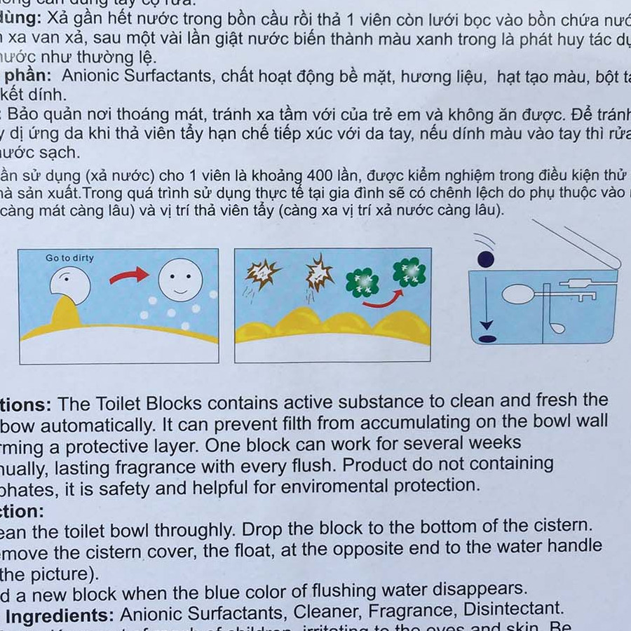 Thông tin sản phẩm Tên sản phẩm : Vỉ 2 viên tẩy và làm thơm toilet Công dụng : Tự động tẩy sạch bồn toilet, khử mùi hôi, lưu lại mùi hương dễ chịu