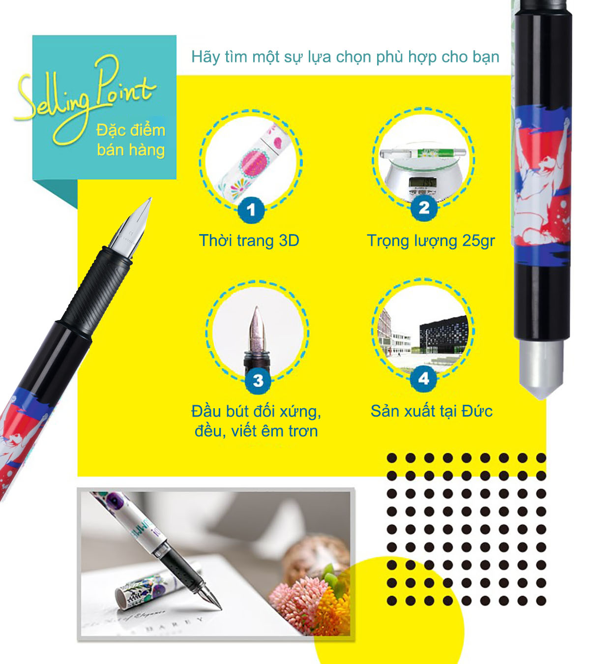 - Màu sắc :Vàng - Đặc điểm : +Thiết kế bút nhẹ, vừa tay cầm + Công nghệ mực Free Ink System giúp mực chảy đều, không bị lem mực, tạo nét viết êm trơn
