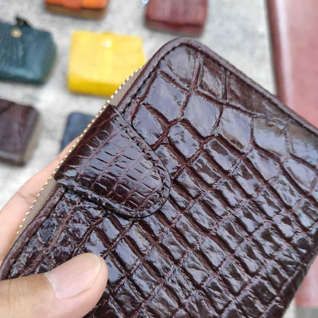Ví da cá sấu cầm tay 2 ngăn khoá kéo | Ví cầm tay màu nâu đỏ