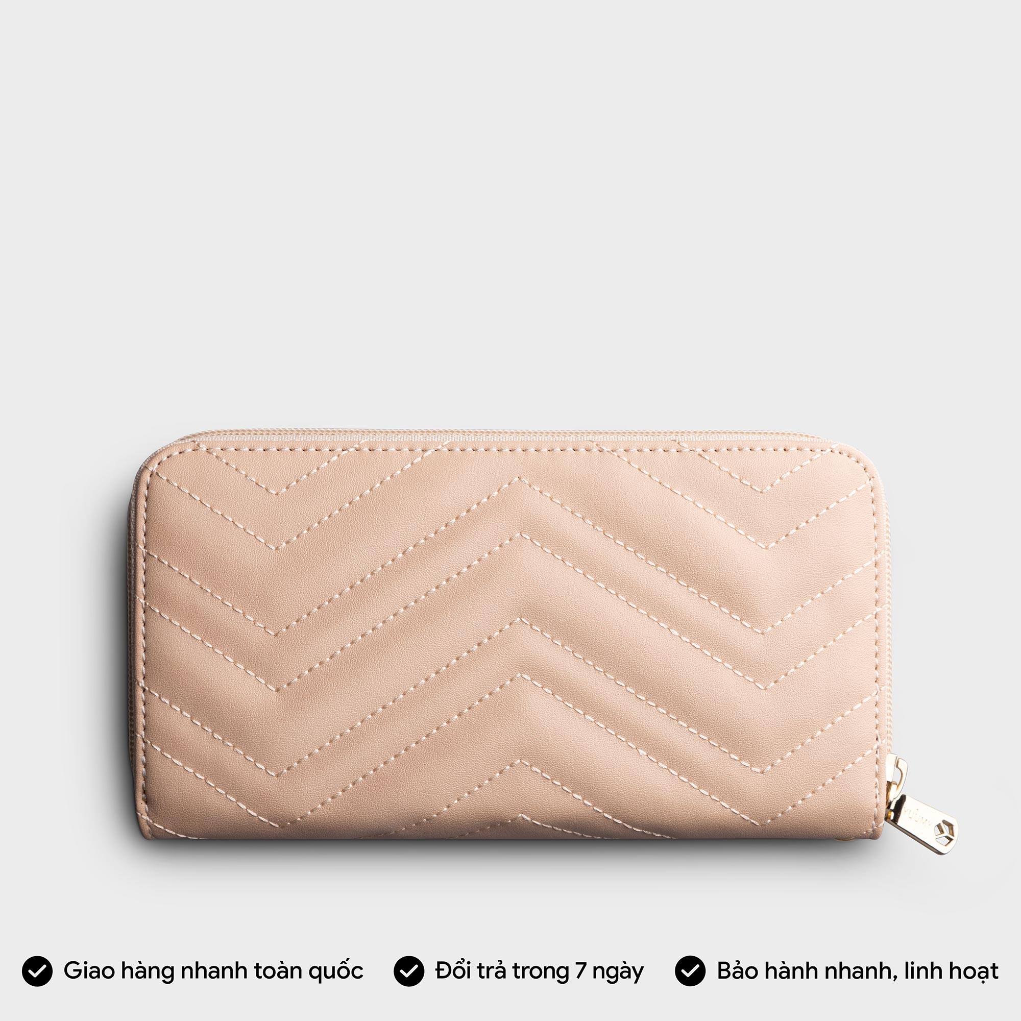 Kích thước: Chiều cao 13.0cm x Chiều ngang 21.0cm x Chiều rộng 4.0cm Ví cầm tay có dây đeo tay tháo rời được Có hai vách ngăn đựng thẻ và điện thoại Dây khóa kéo