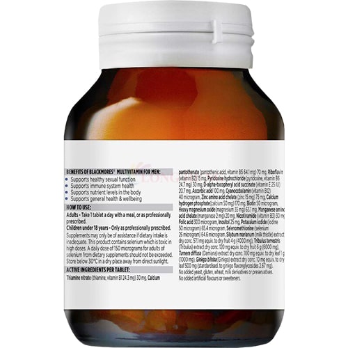 Viên uống Blackmores Men's Multivitamin For Men hỗ trợ sức khỏe nam giới Thành phần : Chứa các vitamin và khoáng chất thiết yếu dành riêng cho nam giới như: Vitamin nhóm B, Vitamin C,