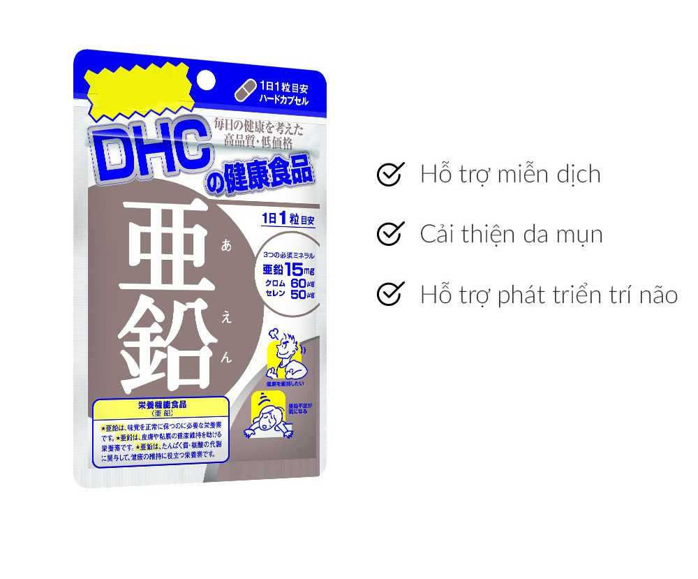 Viên uống kẽm DHC Zinc là một sản phẩm bổ sung hữu hiệu lượng kẽm cần thiết cho cơ thể, giúp bạn có một cơ thể tràn đầy năng lượng! Viên kẽm DHC là thực phẩm chức năng đáp ứng đầy đủ các tiêu chuẩn chất lượng. Sản phẩm hỗ trợ ức chế quá trình tiết bã nhờn và sừng hoá nang lông, cải thiện tình trạng da mụn, giúp duy trì làn da mịn màng và cải thiện tình trạng rụng tóc, tóc xơ cứng.