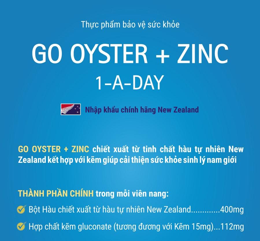 - Tinh chất hàu GO Oyster Plus Zinc có tác dụng gì? Tinh chất hàu GO Oyster Plus Zinc có tác dụng tăng cường sức khỏe sinh lý cho nam giới. Đàn ông trên 18 tuổi là có thể dùng được. Tinh chất hàu GO Oyster Plus Zinc bổ sung hàu và kẽm giúp bồi bổ cơ thể, tăng cường bản lĩnh cho nam giới.