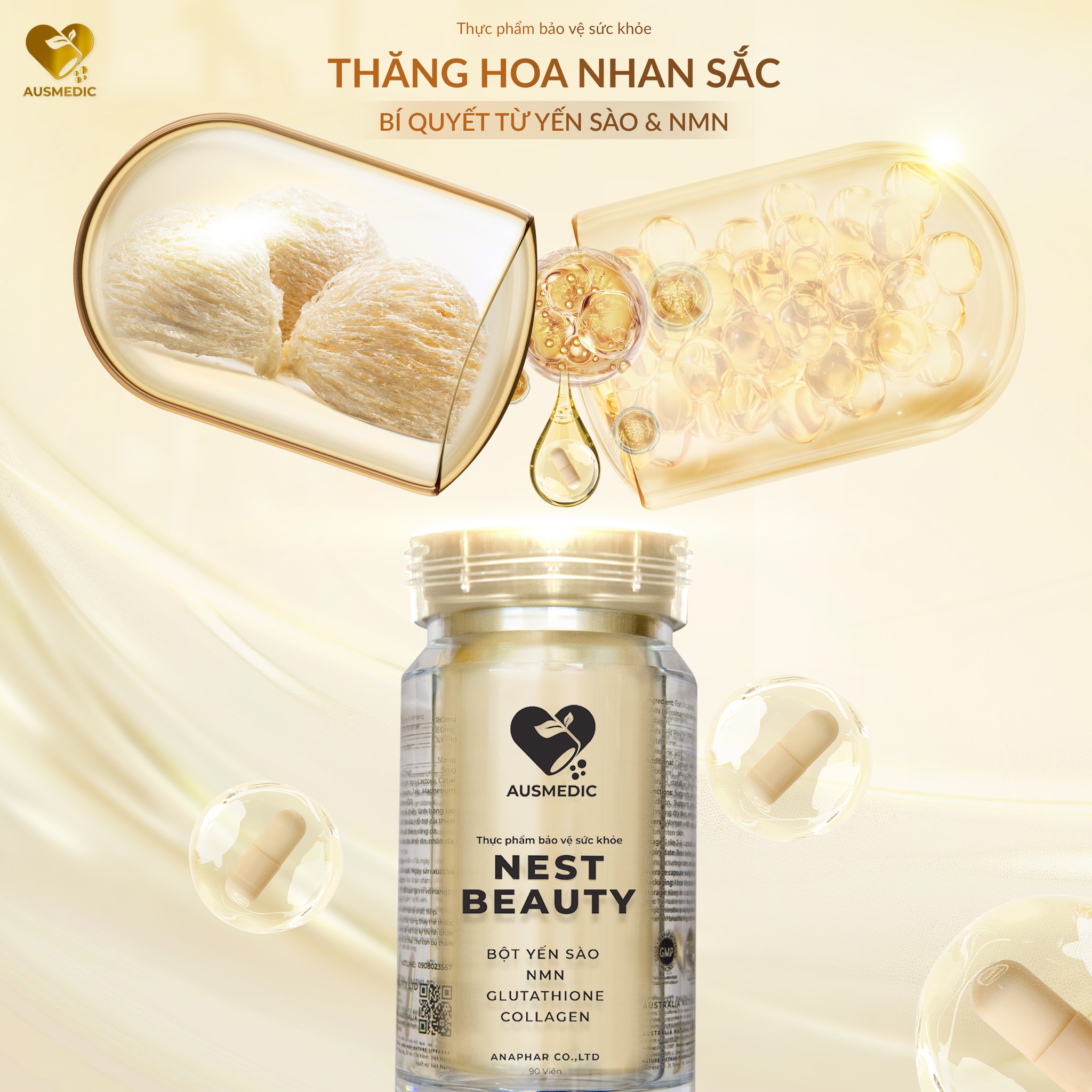 Nest Beauty là sản phẩm viên uống cao cấp, kết hợp hoàn hảo giữa yến sào thật 100%, Nano Collagen, NMN, và Glutathione và các thành phần khác. Sản phẩm đến từ thương hiệu Anaphar, nhập khẩu chính hãng từ Úc, lần đầu tiên xuất hiện tại Việt Nam. Nest Beauty mang lại giải pháp chăm sóc da toàn diện, giúp phái đẹp duy trì vẻ trẻ trung, rạng ngời.