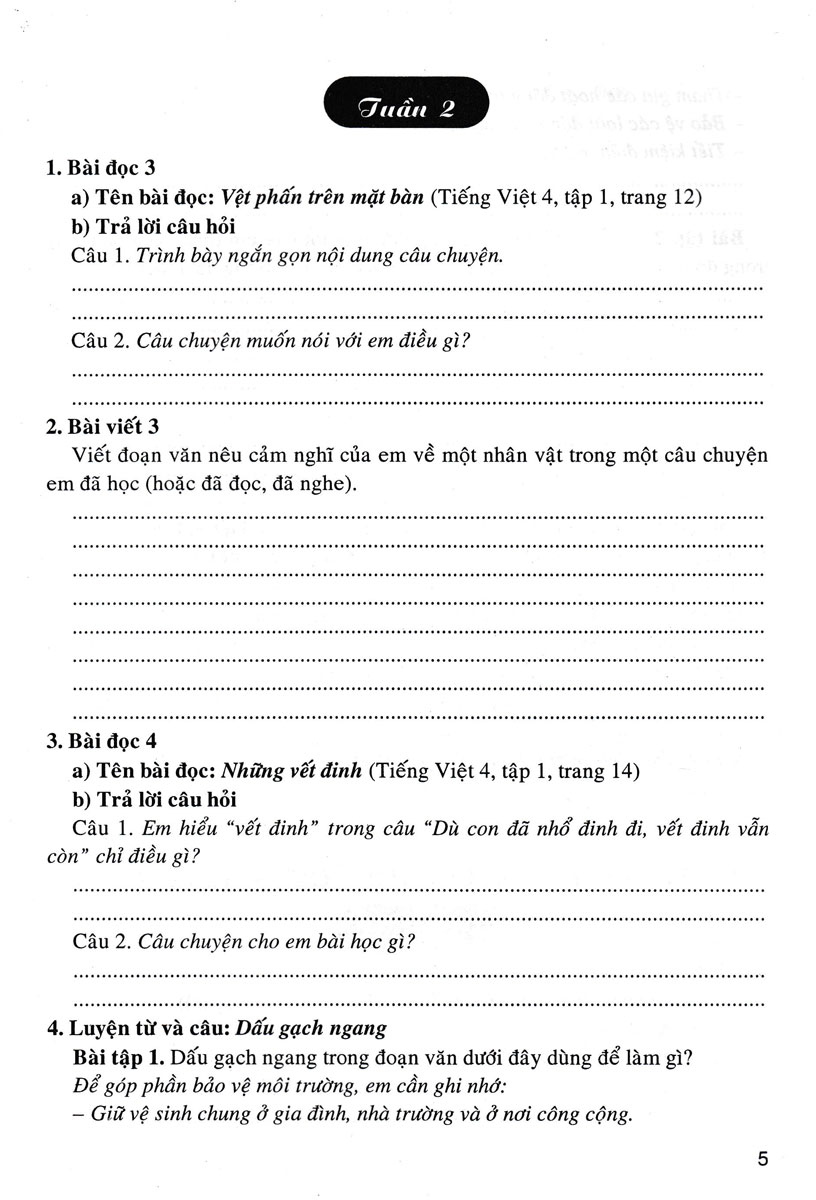 PHẦN GỢI Ý LÀM BÀI: Với các hướng dẫn chi tiết nhằm hỗ trợ các em trong việc so sánh và sửa bài tập. Quyển sách được biên soạn theo đúng chuẩn của Bộ giáo dục và đào tạo, với các bài tập "Tập đọc, luyện từ và câu, viết" sẽ mang đến cho các em nhiều dạng bài để ôn tập và phát triển kĩ năng tư duy khi học bộ môn này.