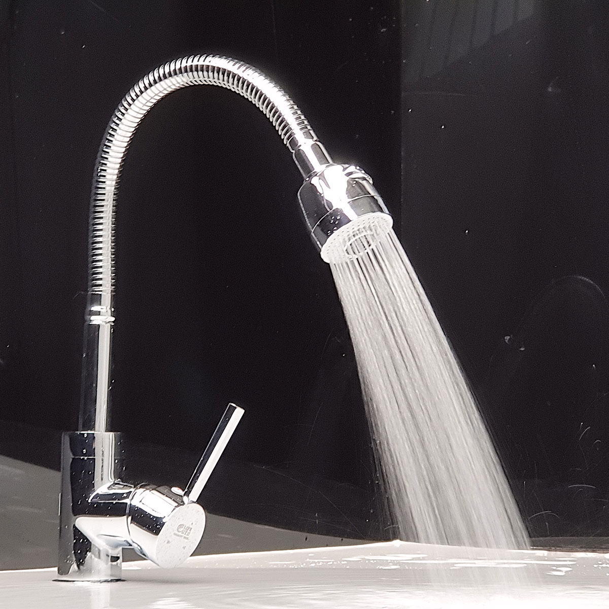 • Cần lò xo linh động với đầu vòi 2 chế độ chảy : Chảy tăng áp - Chảy tạo bọt