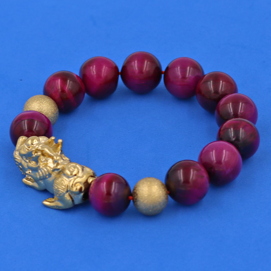 Thông tin sản phẩm : Vòng chuỗi đeo tay đá mắt hổ hồng 14 ly ( size lớn ) charm tỳ hưu và bi inox vàng, vòng tay chuỗi hạt