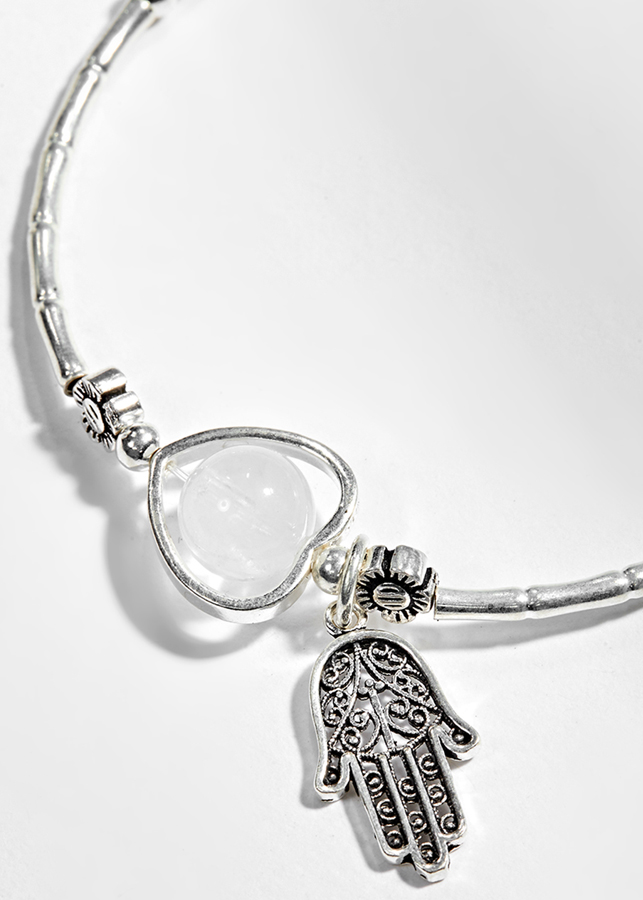 Vòng Tay Bạc 1 Hạt Đá Thạch Anh Ưu Linh Trắng Phối Charm Bàn Tay Hamsa Bạc