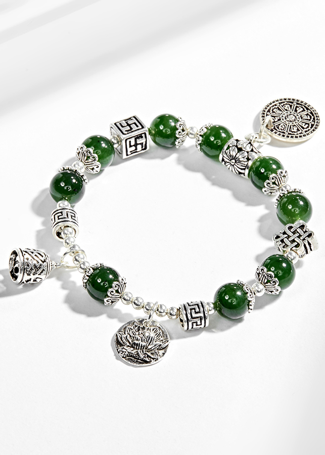 • Vòng tay ngọc bích phối charm hoa sen (10mm) có tác dụng mang đến vận may, giúp người đeo tránh được những rủi ro, các thế lực tà ma và sự nguy hiểm.
