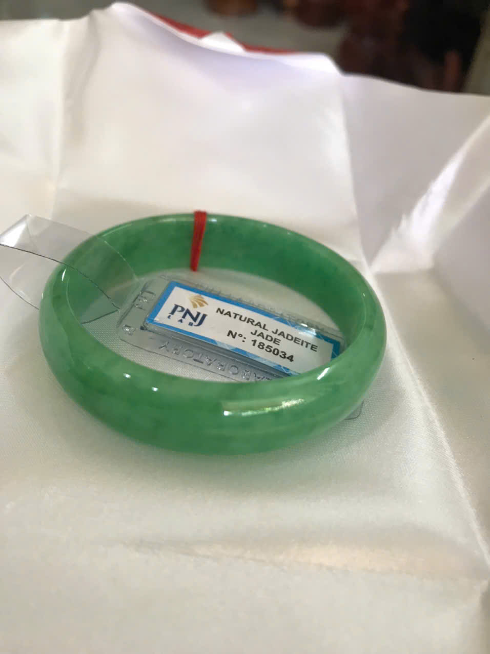 Vòng Tay Nữ Đá Ngọc Cẩm Thạch Tự Nhiên Bản Hẹ Sịn Đậu Lý Sao Ni 48mm Cao 12mm Dầy 6mm đã kiểm định kèm giấy chứng nhận P No 185034 Màu Xanh ngọc lý tươi bóng đều đẹp nữ tay nhỏ 35kg - 48kg ạ