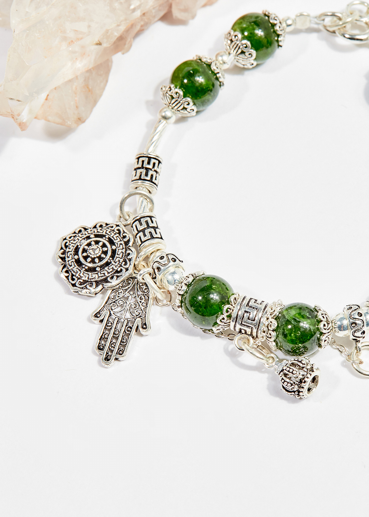 Vòng Thạch Anh Ưu Linh Xanh Phối Hoa Thạch anh xanh Đá Thạch Anh Xanh (Green Aventurine) còn được gọi là “Đá của Cơ Hội”, nó được cho là loại đá mang lại may mắn