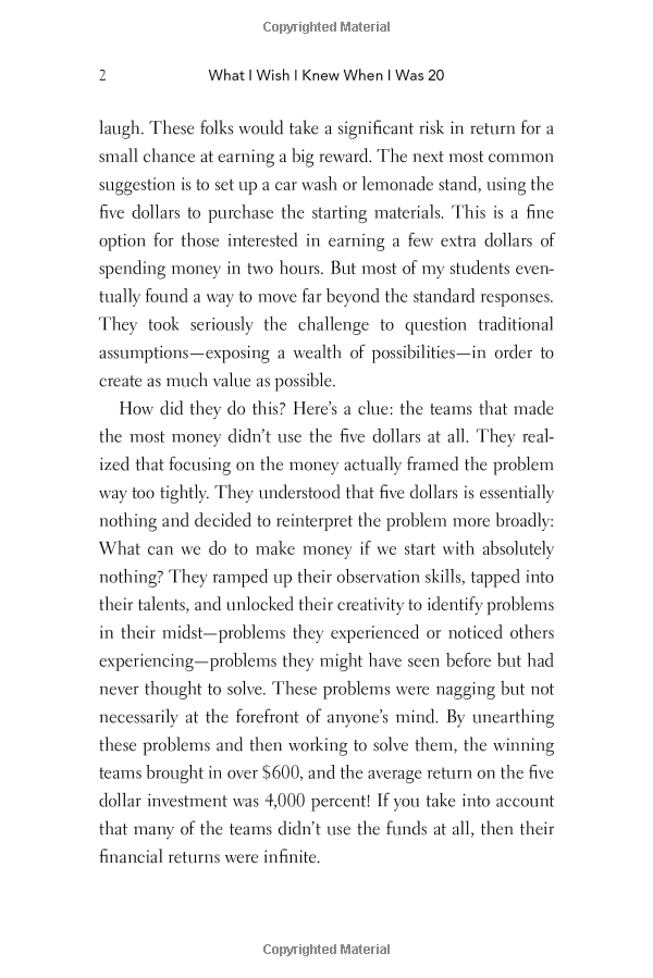 These pages are filled with fascinating examples, from the classroom to the boardroom, of individuals defying expectations, challenging assumptions, and achieving amazing success. Seelig throws out the old rules and provides a new model for reaching our highest potential. We discover how to have a healthy disregard for the impossible, how to recover from failure, and how most problems are remarkable opportunities in disguise.