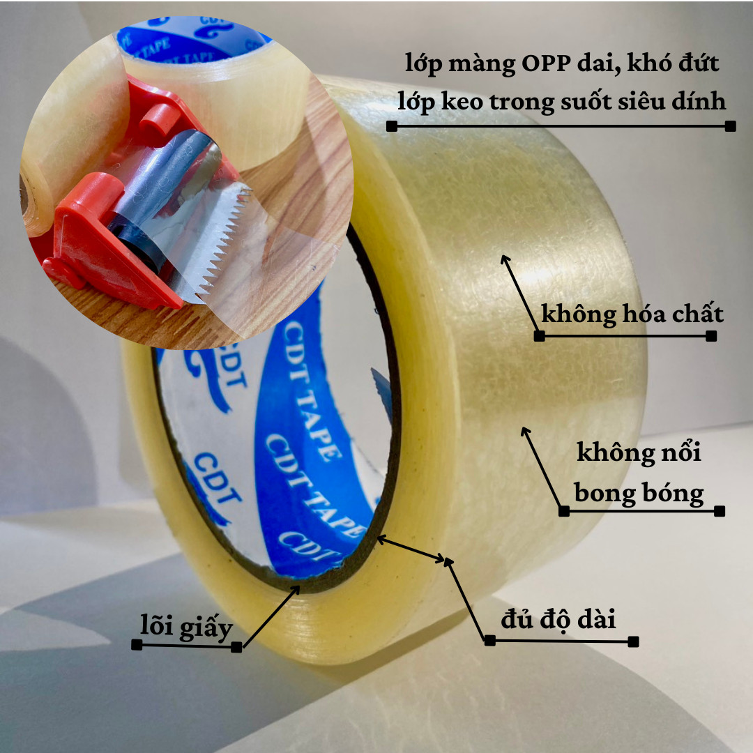 - Quy cách đóng gói: lẻ 1 cuộn ***Cấu tạo của băng keo trong Băng keo trong gồm 3 phần: Lớp keo: độ bám dính cao, bám chắc trên bề mặt bằng công nghệ phân tán lực, chống bo góc sau một thời gian sử dụng. Lớp đế: Làm bằng OPP, bền, dai, không thấm nước và hiếm khi bị gãy theo chiều ngang. Lõi giấy bìa cứng: dày và cứng, chịu được tải trọng lên đến 10kg. Ngoài ra, sau khi sản xuất, mỗi cuộn băng dính được bao phủ bởi một lớp nilon riêng biệt, giúp ngăn chặn bụi bẩn, tan chảy và duy trì thời gian sử dụng lâu dài của sản phẩm.