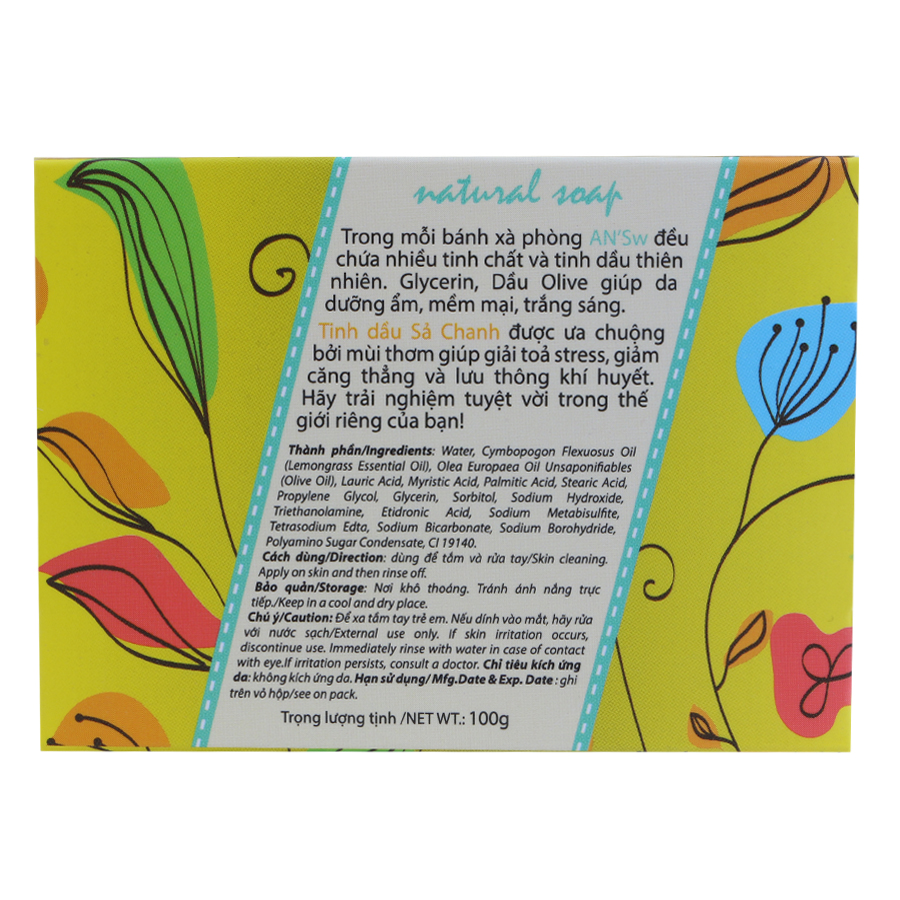 Xà Phòng Thiên Nhiên AN'Sw Tinh Dầu Sả Chanh - XP-SC Với sự kết hợp giữa tinh dầu Sả Chanh, dầu Olive và Glycerin xà phòng thiên nhiên An’sw giúp làm sạch và không gây khô da, dưỡng da mềm mại. Tinh dầu Sả Chanh thanh mát, giúp bạn thư giãn tinh thần và nâng cao khả năng tập trung.