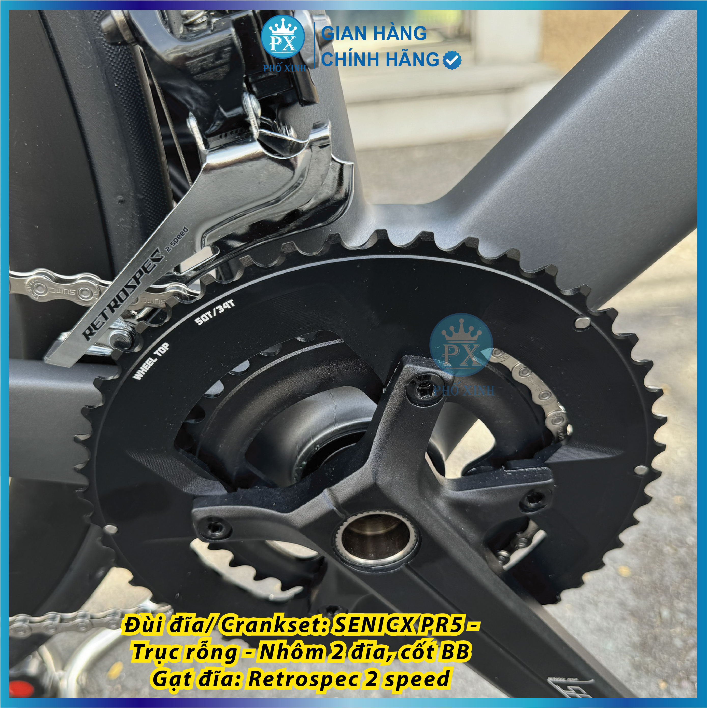 - Đùi đĩa/ Crankset: SENICX PR5 -Trục rỗng - Nhôm 2 đĩa, cốt BB