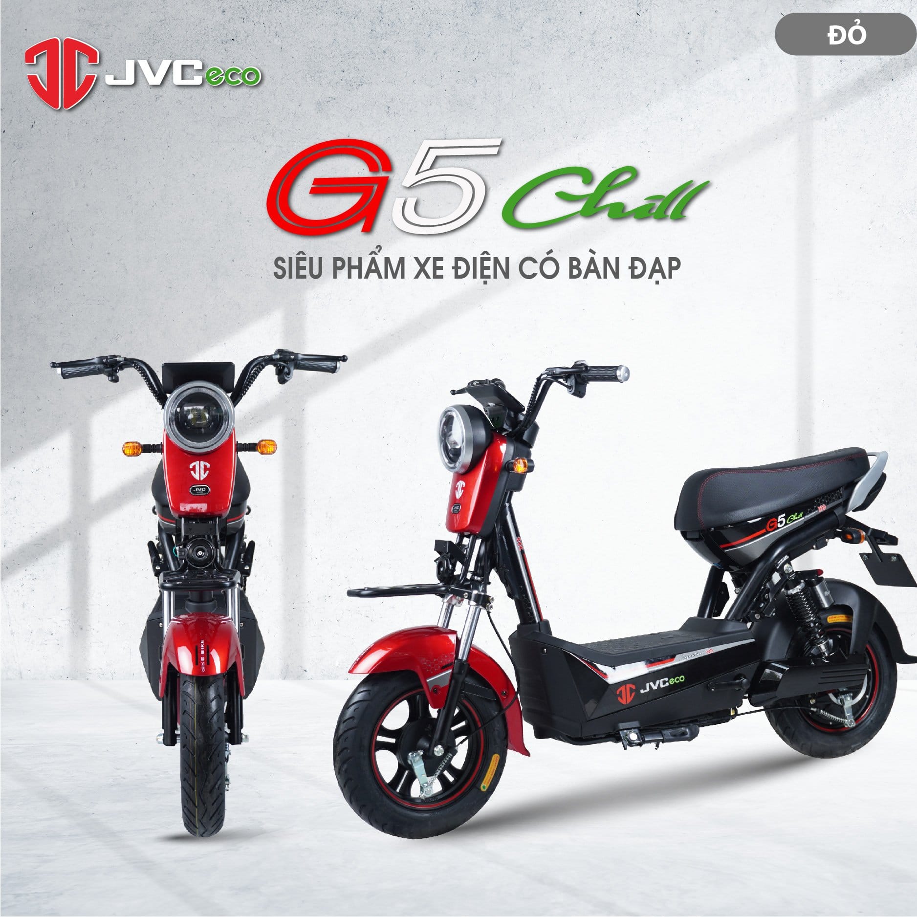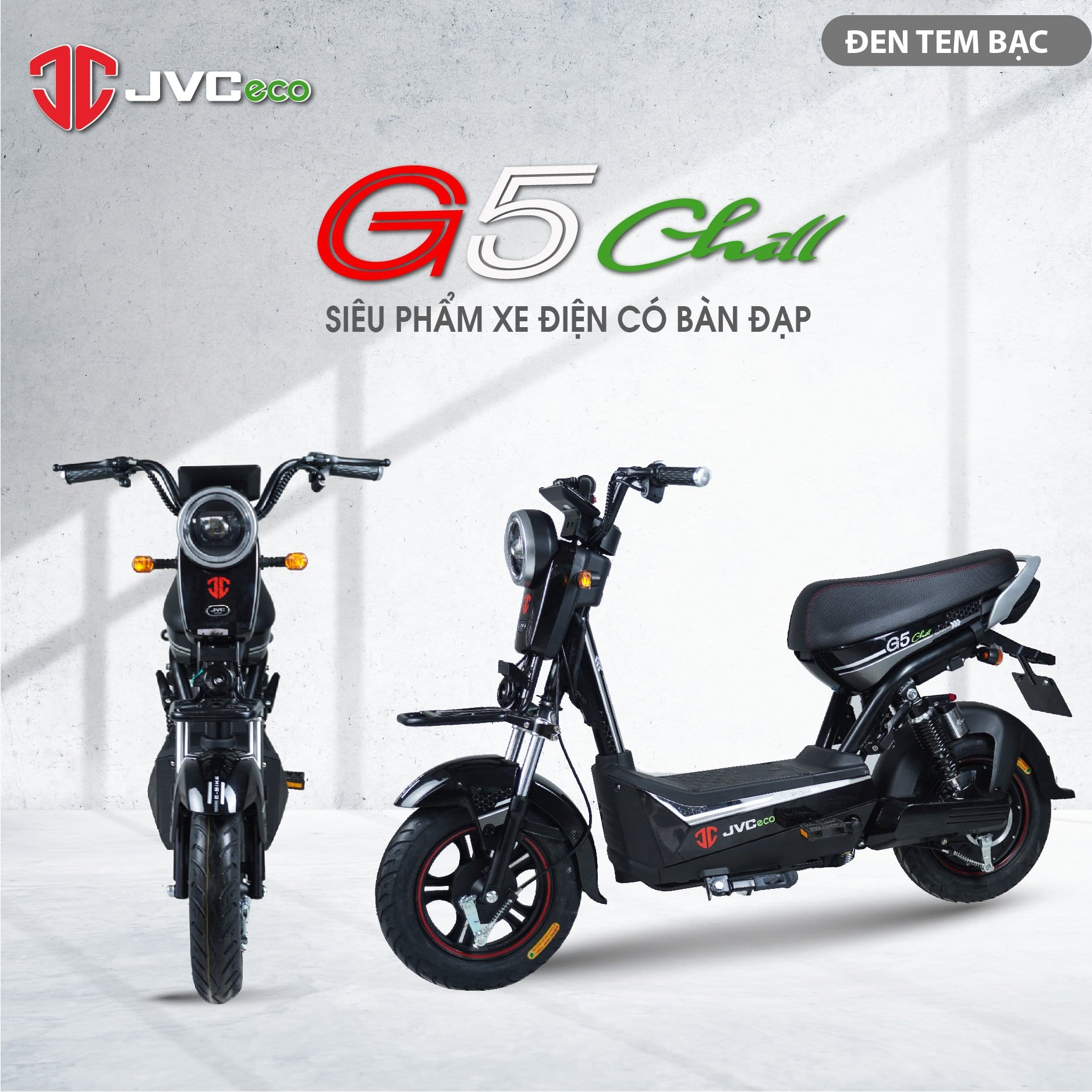 Mua tại TiktokJVC G5 CHILL XE ĐIỆN CÓ BÀN ĐẠP ️ JVC G5 CHILL được thiết kế theo phong cách HIỆN ĐẠI, TINH TẾ mang tới sự tự tin cho người lái ƯU ĐIỂM NỔI BẬT CỦA JVC G5 CHILL Bàn đạp trợ lực hỗ trợ hành trình di chuyển Bộ tem mới thiết kế THỜI TRANG Đèn pha dạng tròn góc sáng rộng hơn Tay ga, công tắc, tay phanh cao cấp đến từ thương hiệu Wuxing Đồng hồ dẹt hiển thị thông minh Yên xe êm ái in dấu ấn logo JVC Động cơ mới kết hợp với bộ điều khiển không dây Ắc quy được bổ sung thanh giằng bình chắc chắn tuyệt đối, tháo lắp dễ dàng hơn Vành trước nhập khẩu có thiết kế riêng biệt đồng bộ với động cơ Giam xóc sau nâng cấp chất lượng, bảo hành 12 tháng Động cơ và khung xe bảo hành 36 tháng Bình ắc quy bảo hành 18 tháng