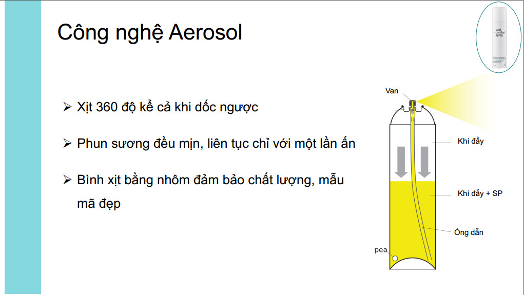 - Công nghệ Aerosal xịt 360 độ, giúp xịt sâu vào trong băng bột, hiệu quả tại đích