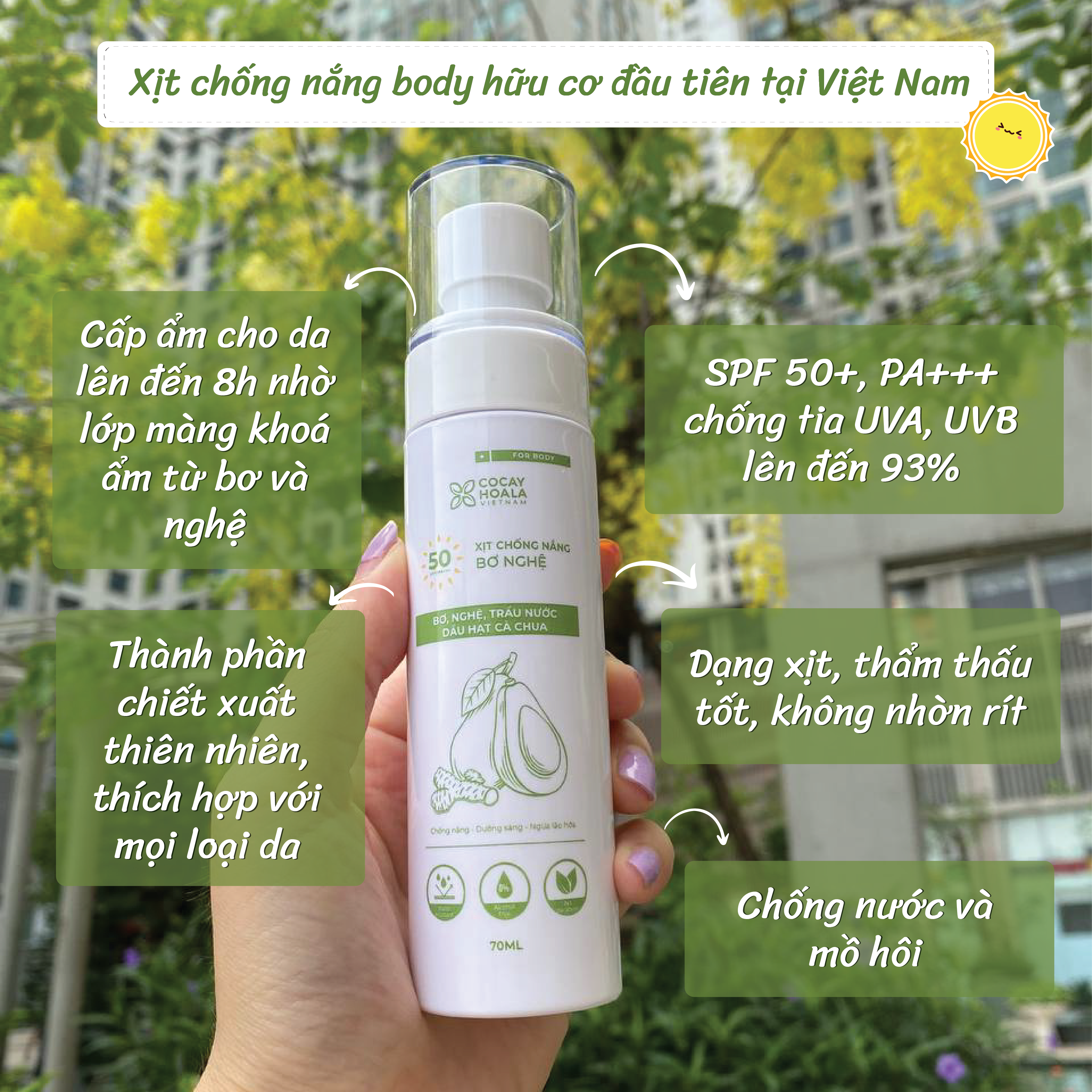 Mua tại TiktokTặng kèm dầu tẩy trang 20ml Xịt Chống Nắng Body Bơ Nghệ Cocayhoala- Nâng Tone, Không Bết Dính, Dưỡng Da Và Bảo Vệ Toàn Diện SPF 50+