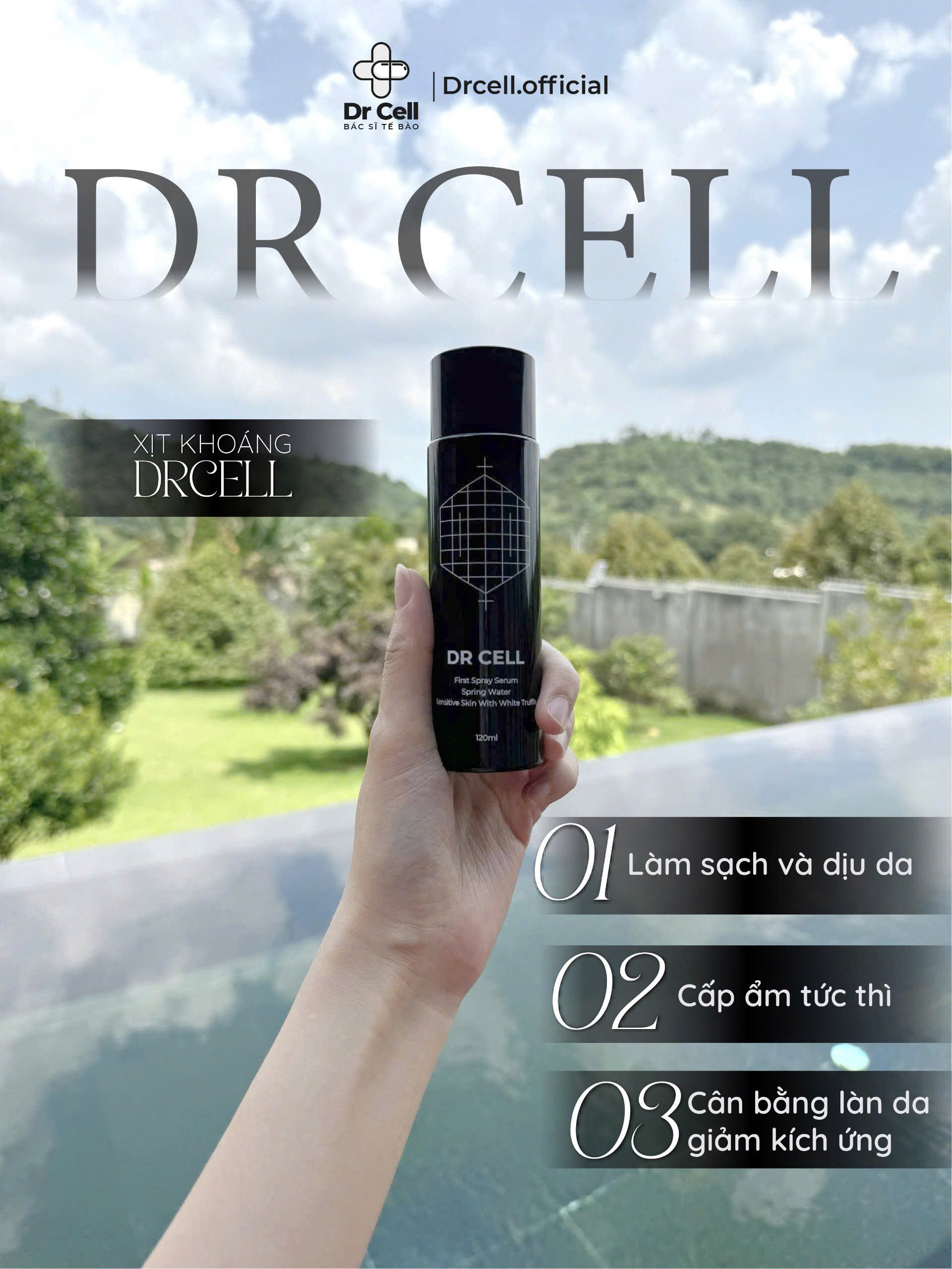 Xịt khoáng tế bào gốc Dr Cell - 120ml Serum khoáng chất Dr Cell với độ tinh khiết & đặc tính làm dịu mang cảm giác tươi mát, dễ chịu, dịu nhẹ da ngay tức thì. Dùng sau thủ thuật da liễu hay can thiệp thẩm mỹ, da bị đỏ, bỏng nắng, hăm tã,.. Hoặc dùng sau tẩy trang, sau cạo râu, sau khi chơi thể thao, sau tẩy lông... THÀNH PHẦN: Earth Marine Water, Willow Bark Extract, Selenium, ZinC, PDRN Sodium DNA, Betaine, Panthenol. Ngoài thành phần chính là nước khoáng, xịt khoáng Tế Bào Gốc Dr Cell còn có thêm sự kết hợp độc đáo giữa các khoáng chất và nguyên tố vi lượng như Selenium, Zinc, có tác dụng làm dịu da, giảm tình trạng đỏ rát khó chịu và chống oxy hoá. PDRN Sodium DNA tế bào gốc cá hồi có độ tương thích với DNA của người lên tới 95%, có tác dụng thúc đẩy tái tạo tế bào làn da bị tổn thương, giúp tăng sinh collagen và elastin, làm tăng độ đàn hồi và dưỡng da sáng hồng căng bóng tự nhiên. Betaine : Có tác dụng thúc đẩy tái tạo cấu trúc da, ngăn ngừa hình thành nếp nhăn, giữ nước cho làn da và củng cố hàng rào bảo vệ da. Panthenol : Giúp làm mềm, làm dịu da. CÁCH SỬ DỤNG: - Giữ vòi xịt cách mặt khoảng 20cm, nhấn giữ