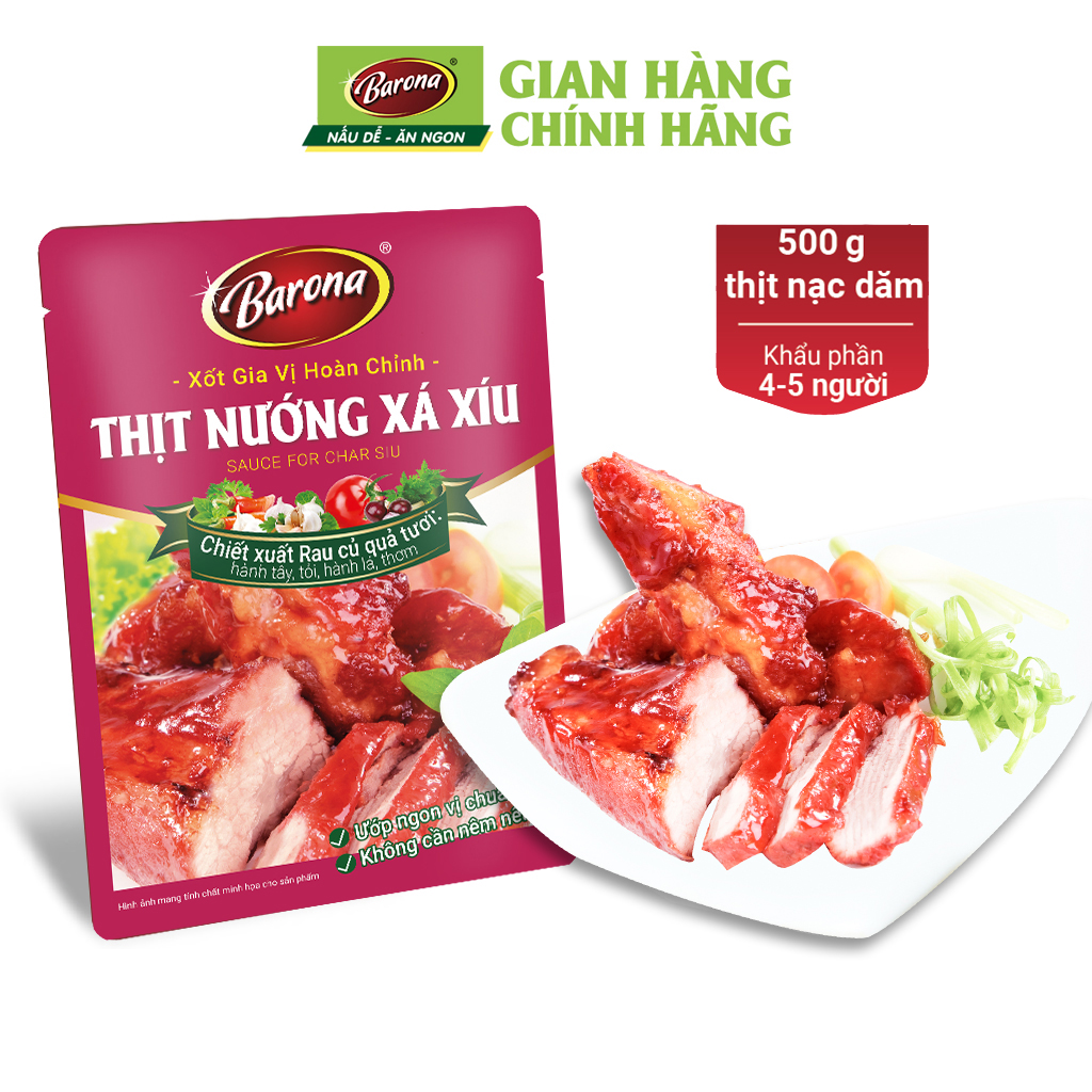 XỐT GIA VỊ HOÀN CHỈNH BARONA THỊT NƯỚNG XÁ XÍU 80G Xốt Gia Vị Hoàn Chỉnh Barona là công thức phối trộn độc đáo giữa CHIẾT XUẤT RAU CỦ QUẢ TƯƠI như hành, tỏi, me,