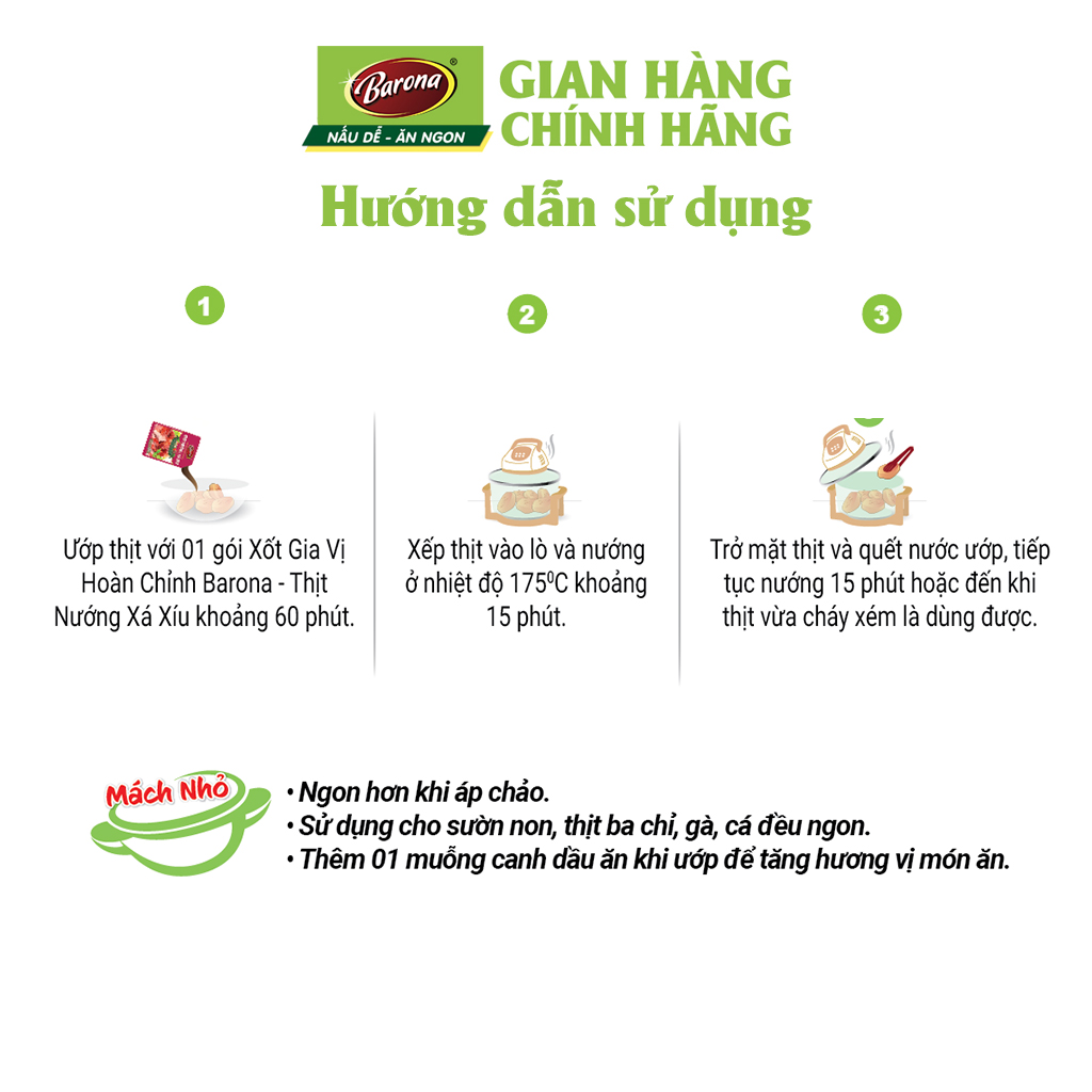 Gia Vị Nướng BBQ Barona 80g tươi ngon chuẩn vị không cần nêm nếm Xốt gia vị hoàn chỉnh Barona - Nướng BBQ là gia vị cao cấp được chiết xuất rau củ quả tươi và mật ong nguyên chất, được nêm nếm hoàn chỉnh giúp việc nấu món ăn trở nên tiện lợi và dễ dàng hơn bao giờ hết. *Điểm mạnh: - Thành phần chiết xuất RAU CỦ QUẢ TƯƠI như hành tây, tỏi, hành lá, cà chua cùng MẬT ONG nguyên chất.  - Nấu ngon vị chuẩn, không cần nêm nếm - Tiện và nhanh, ai cũng có thể nấu món nướng BBQ ngon như ngoài hàng *Hạn sử dụng: 12 tháng *Quy cách:     *Hướng dẫn thực hiện: Nướng BBQ - Nguyên liệu (khẩu phần ăn 4-5 người) Gói gia vị nướng BBQ (gia vị  hoàn chỉnh Barona - Nướng BBQ ): 1 gói Thịt (heo, bò, gà…): 500g - Cách ướp thịt nướng ngon mê say:   *Mách nhỏ:  - Sử dụng cho sườn non, thịt ba chỉ, cá, hải sản đều ngon. - Thêm 40ml sữa tươi vào khi ướp để món nướng béo thơm và mềm hơn - Có thể sử dụng bếp than, lò vi sóng, nồi chiên không dầu để nướng  #Nuongbbq #giavibarona #naucomnhanhobarona