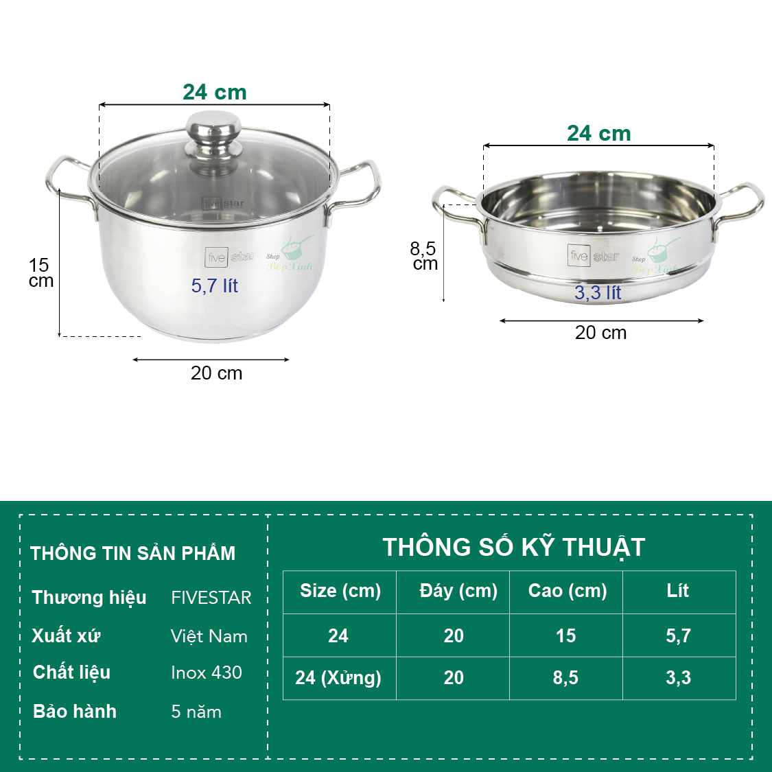 Bộ nồi xửng hấp Inox 3 đáy Fivestar 30cm bền đẹp, bảo hành 5 năm chuẩn hàng Việt Nam chất lượng cao