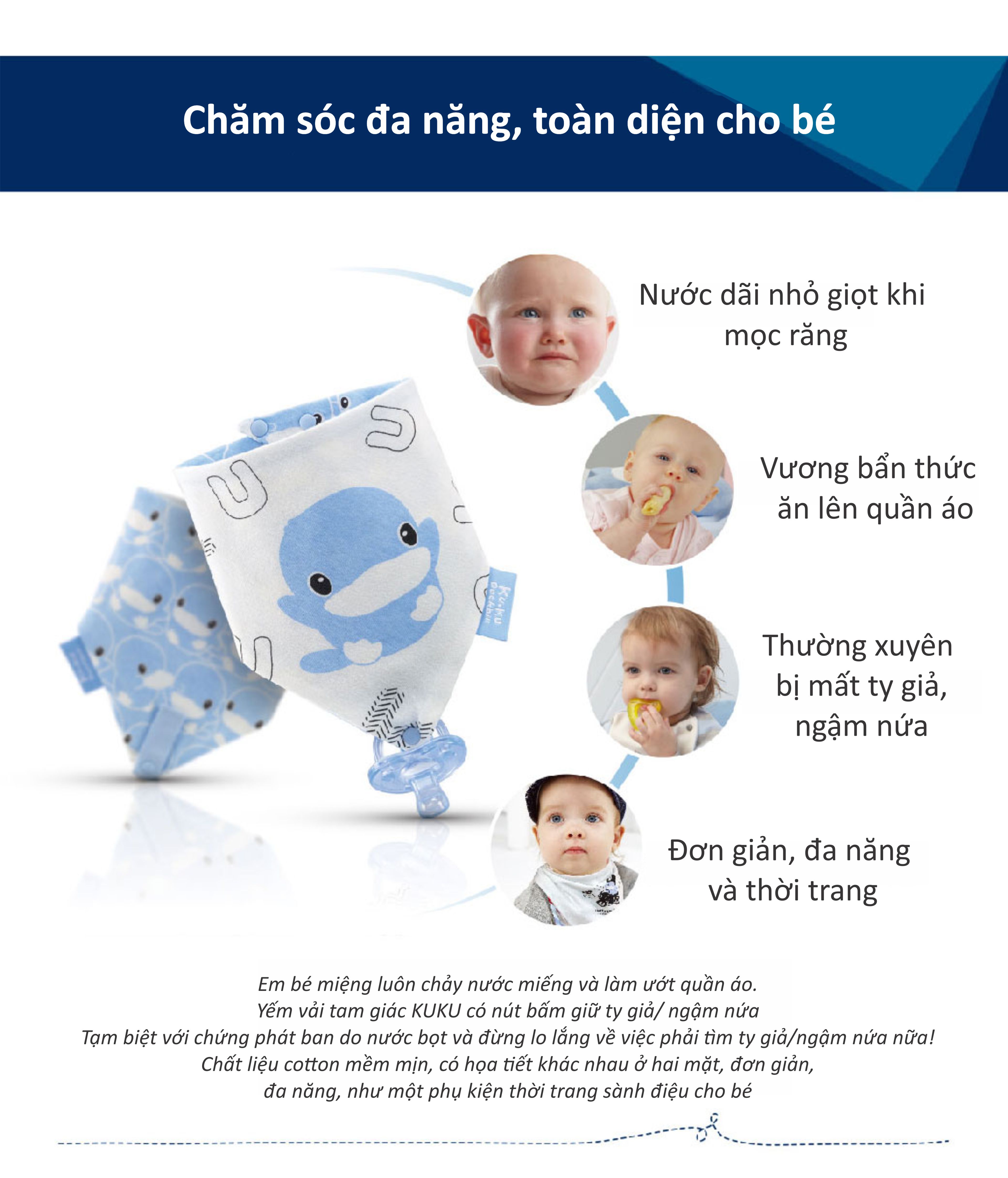 Yếm Em Bé KuKu KU2229 được thiết kế choàng cổ dễ mặc, 2 tay bé có thể cử động thoải mái khi dùng chiếc yếm này. Phẩn cổ yếm có bo thun giúp cố định tốt,