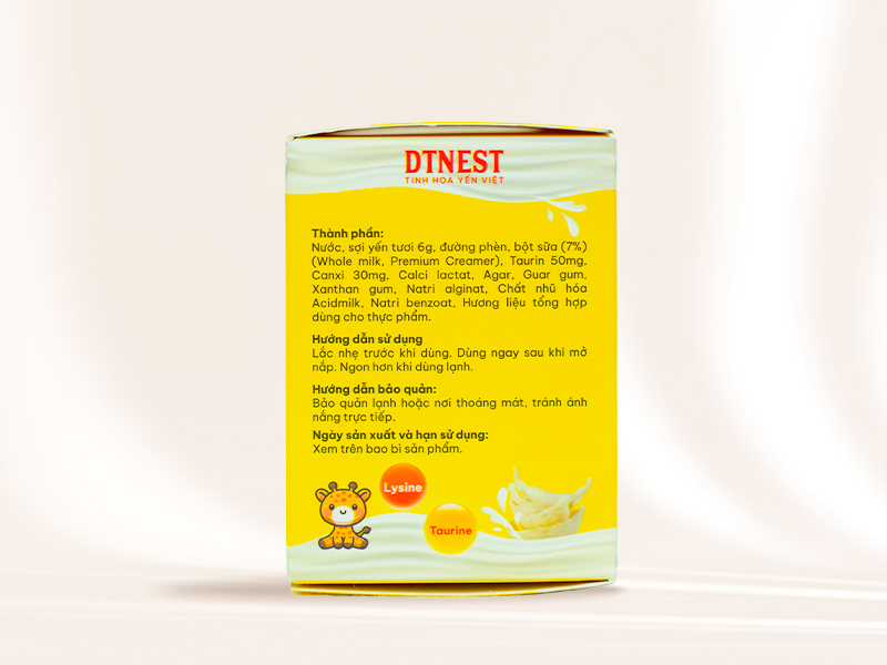 - Thành phần: Nước, sợi yến tươi 6g, đường phèn, bột sữa (7%)(Whole milk, Premium Creamer), Taurin 50mg, Canxi 30mg, Calci Lactat, Agar, Guar gum, Xanthan gum, Natri alginat, Chất nhũ hóa Acidmilk, Natri benzoat,