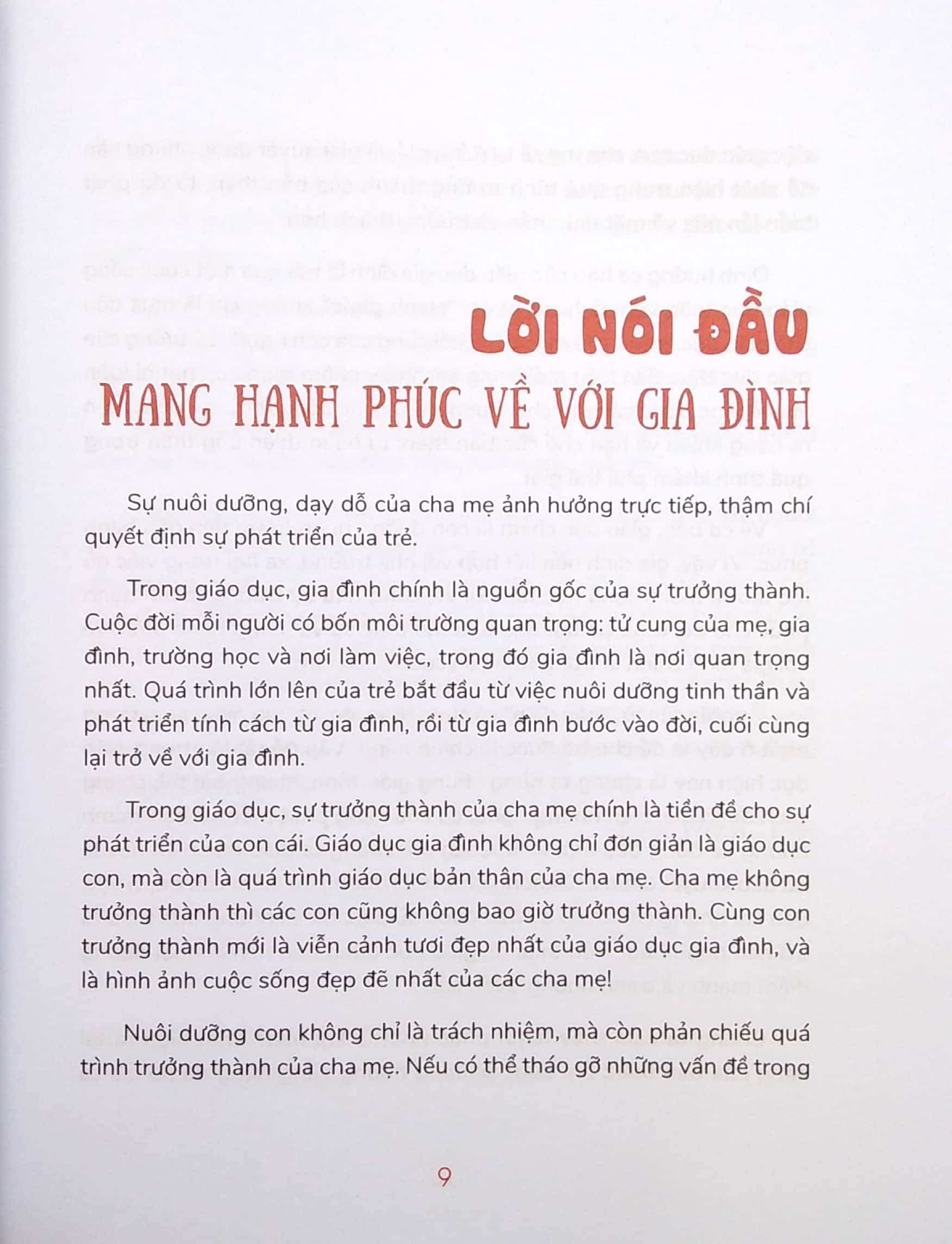 Yêu Con Như Thế Là Vừa Đủ - Làm Gì Khi Con Lắm Chuyện (Cẩm Nang Nuôi Dạy Trẻ 2 - 3 Tuổi) Sự nuôi dưỡng, dạy dỗ của cha mẹ ảnh hưởng trực tiếp, thậm chí quyết định sự phát triển của trẻ. Trong giáo dục, gia đình chính là nguồn gốc của sự trưởng thành. Cuộc đời mỗi người có bốn môi trường quan trọng: tử cung của mẹ, gia đình, trường học và nơi làm việc, trong đó gia đình là nơi quan trọng nhất. Quá trình lớn lên của trẻ bắt đầu từ việc nuôi dưỡng tinh thần và phát triển tính cách từ gia đình, rồi từ gia đình bước vào đời, cuối cùng lại trở về với gia đình. Trong giáo dục, sự trưởng thành của cha mẹ chính là tiền đề cho sự phát triển của con cái. Giáo dục gia đình không chỉ đơn giản là giáo dục Con, mà còn là quá trình giáo dục bản thân của cha mẹ. Cha mẹ không trưởng thành thì các con cũng không bao giờ trưởng thành. Cùng con trưởng thành mới là viễn cảnh tươi đẹp nhất của giáo dục gia đình, và là hình ảnh cuộc sống đẹp đẽ nhất của các cha mẹ!